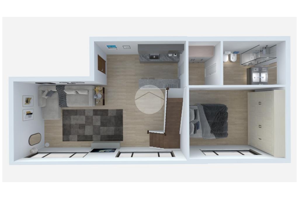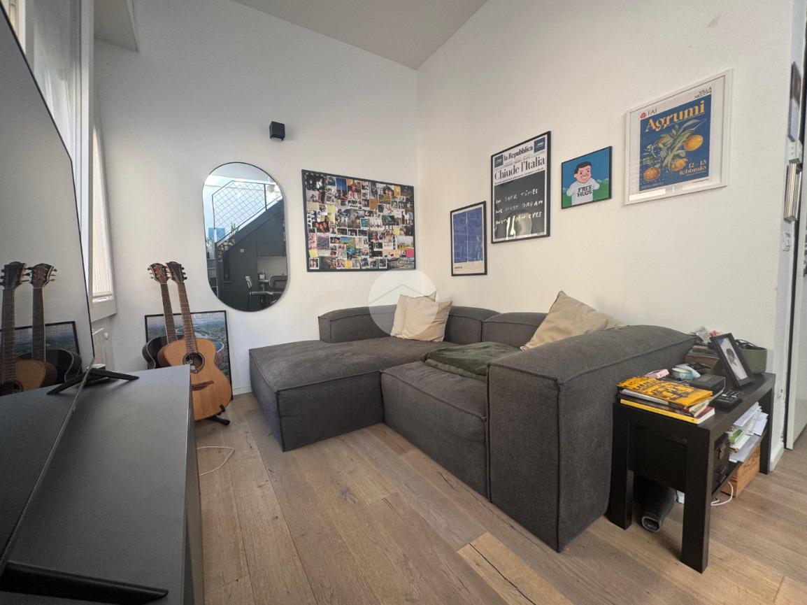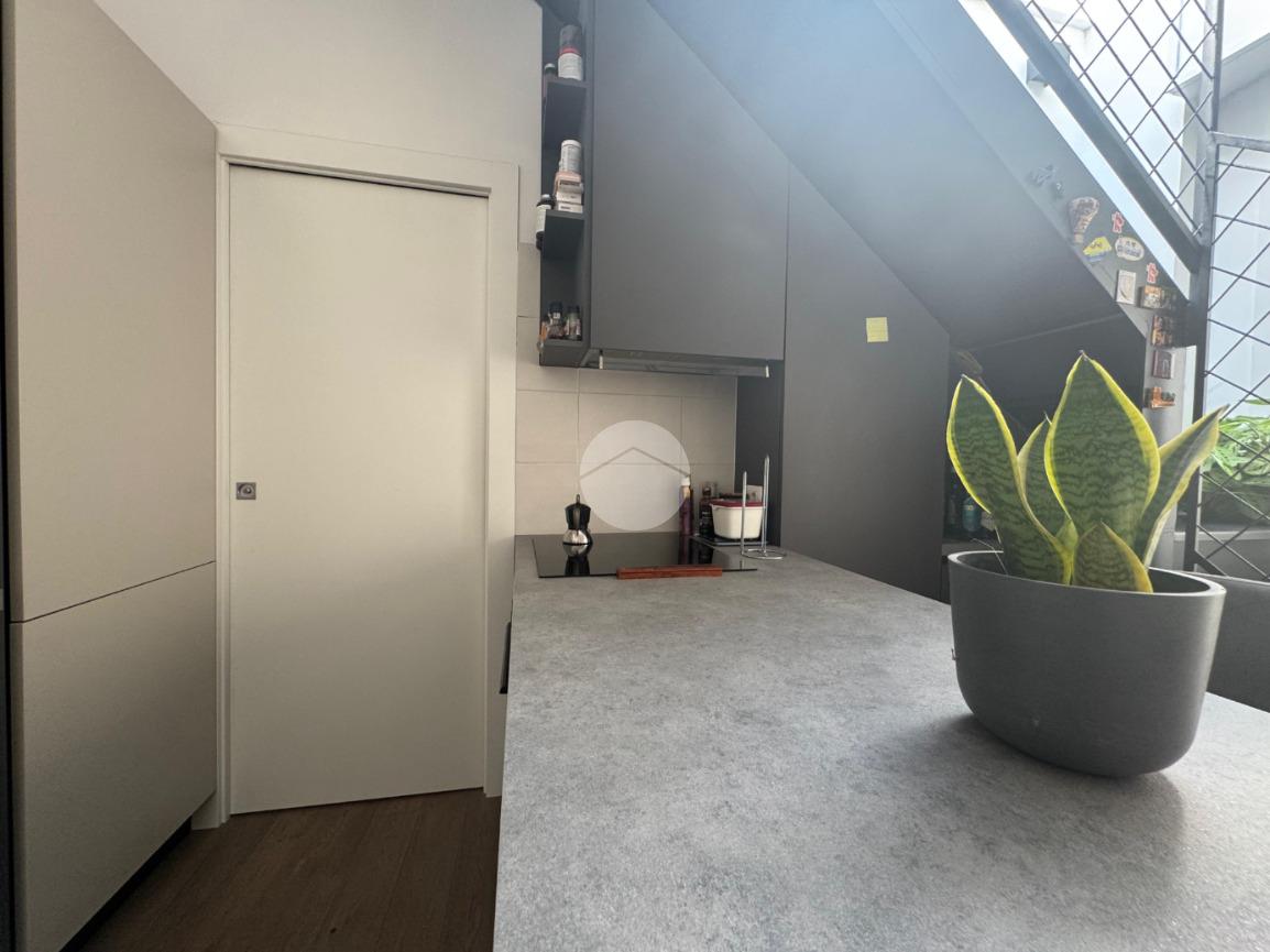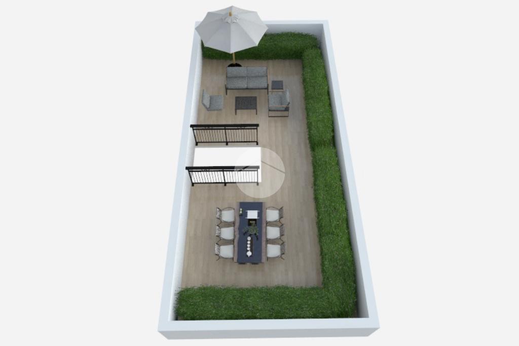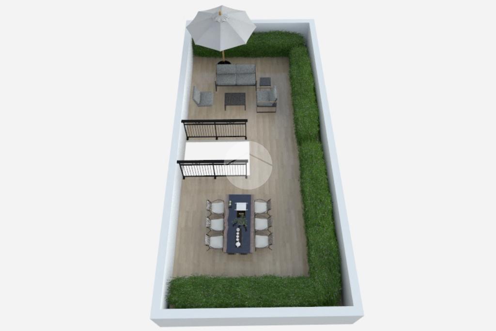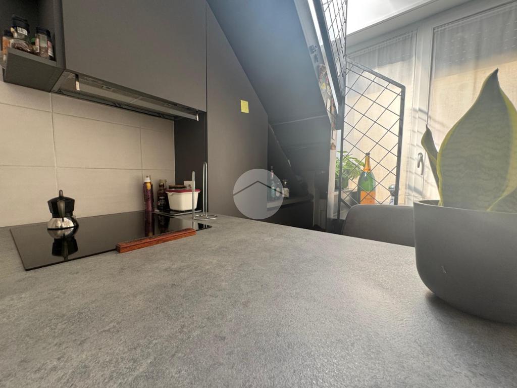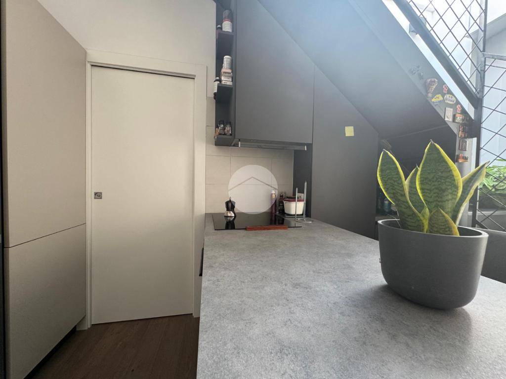 L’appartamento si apre su una luminosa zona living con cucina a vista, sapientemente organizzata per coniugare stile e funzionalità. Dalla zona giorno, una scala conduce all’esclusivo terrazzo di 30 mq, uno spazio esterno ideale per momenti di relax, pranzi all’aperto o per chi desidera vivere la casa anche all’esterno.