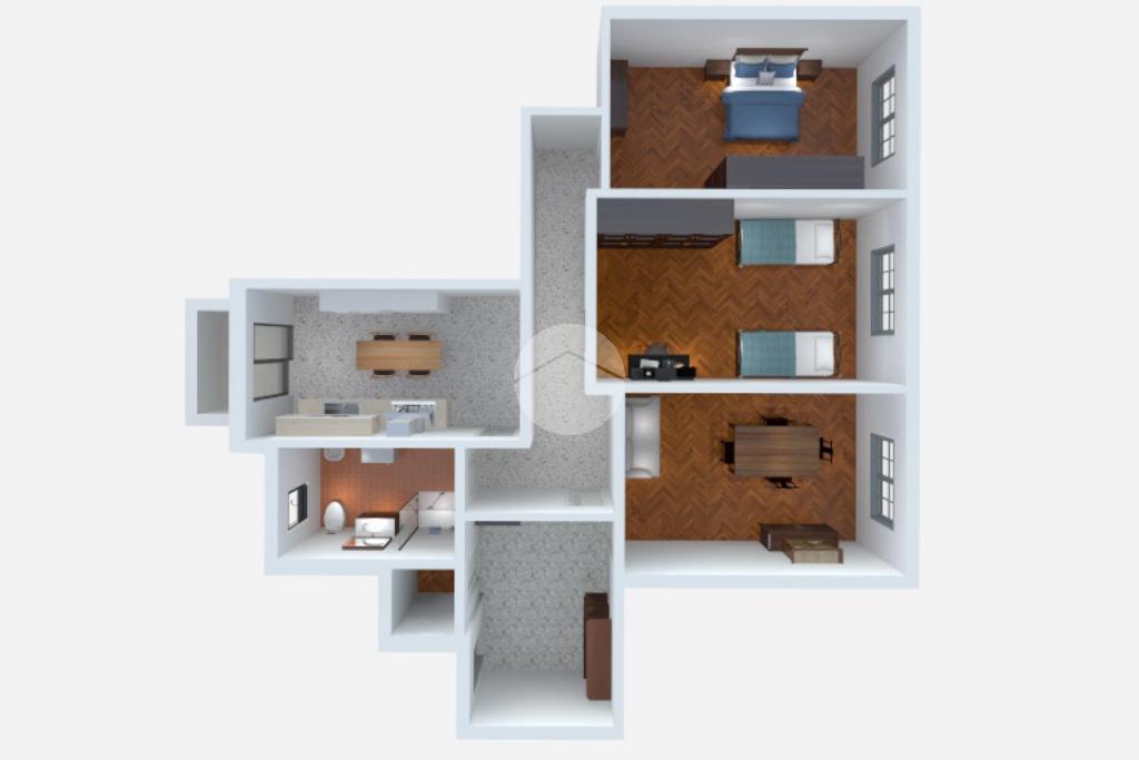 L’appartamento, posto al piano rialzato, si distingue per la razionale distribuzione degli spazi e per la doppia esposizione, interna ed esterna. L’ingresso conduce ad un comodo disimpegno che apre sull'ampio soggiorno ideale per momenti di convivialità. Un corridoio con armadiatura a muro accompagna alla zona notte, composta da due camere da letto matrimoniali.